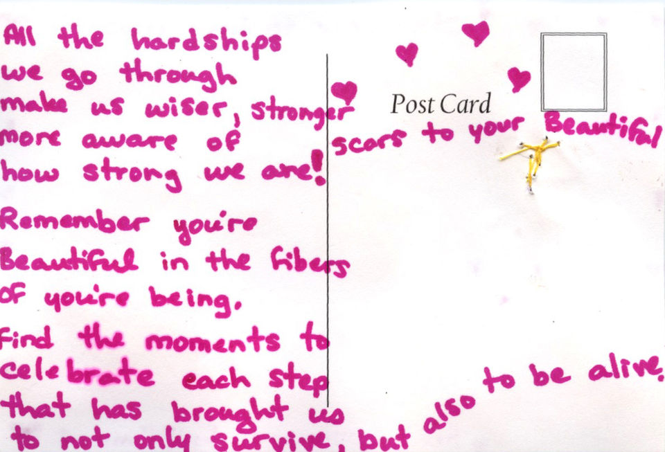 Each postcard is handmade and unique. No two cards have ever looked just alike. Each postcard represents a unique voice and a chance to be fully expressed.